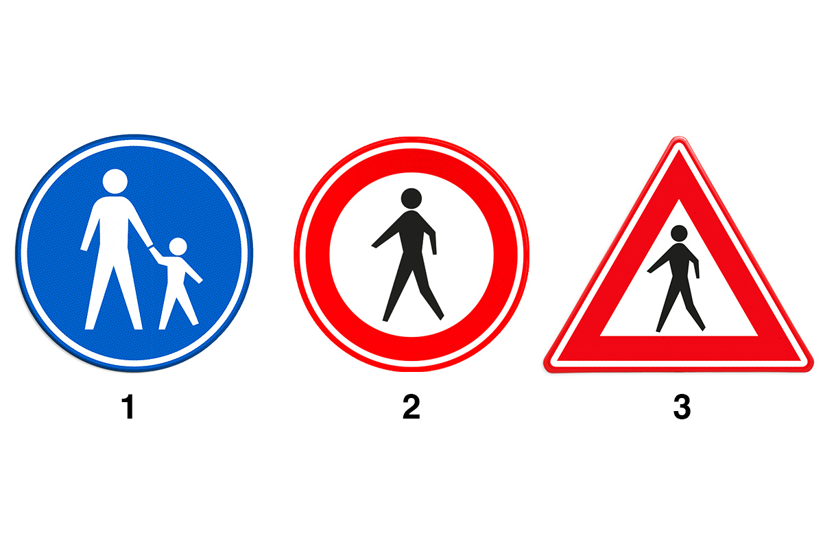 Verkeersbord 2 is een verbod voor voetgangers en verkeersbord 3 is een waarschuwing voor voetgangers.
