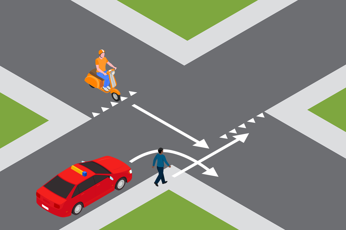 De voetganger mag hier als eerste, daarna de bestuurder van de grijze auto en als laatste de lesauto. De afbuigende auto moet de voetganger voor laten gaan: rechtdoor op dezelfde weg gaat voor. Deze regel geldt voor bestuurders en voor voetgangers. De lesauto rijdt weg uit een uitrit en moet al het verkeer, waaronder voetgangers, voor laten gaan.