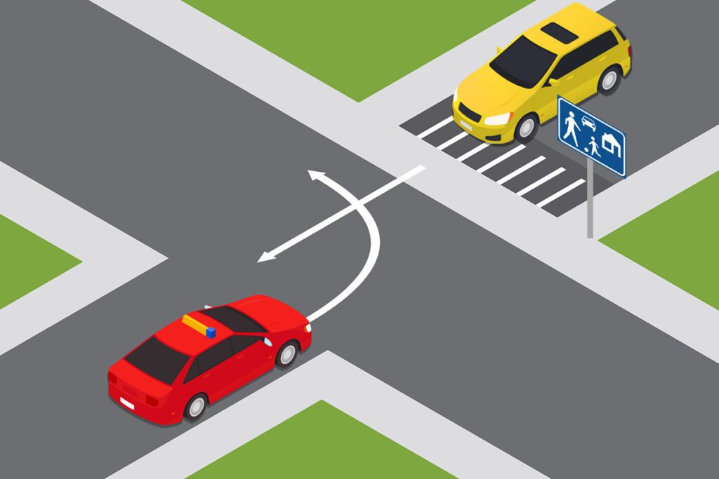 In deze situatie slaan beide bestuurders linksaf: voor deze situatie bestaat geen voorrangsregel. Je moet het dus onderling oplossen door oogcontact te maken, te gebaren, of signalen te gebruiken.