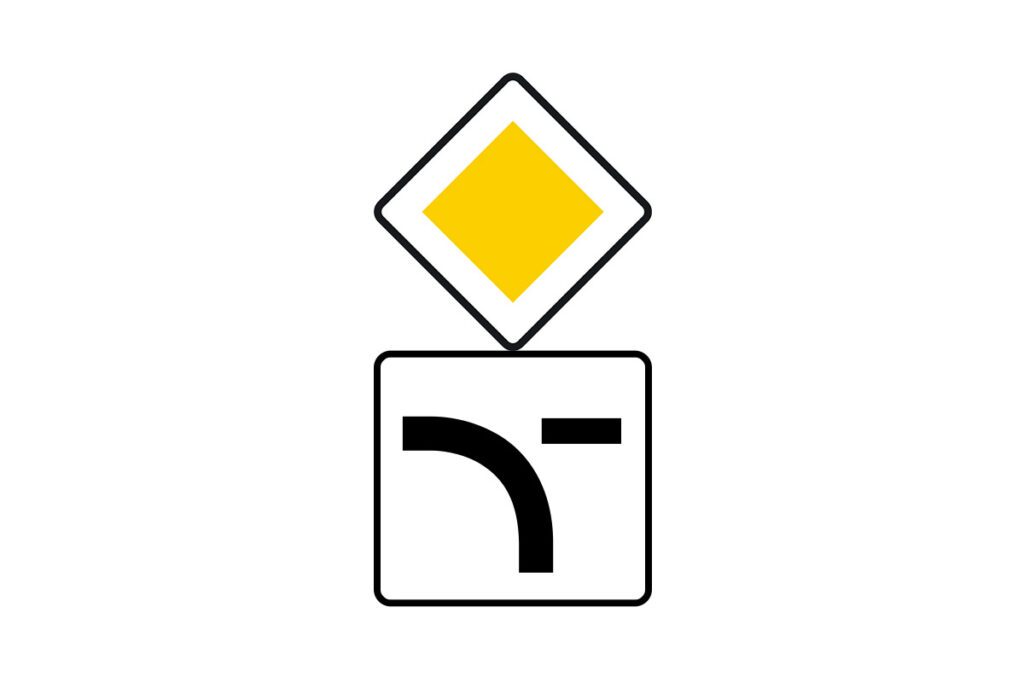 Het bovenste bord duidt een voorrangsweg aan, het onderbord specificeert dat deze voorrangsweg afbuigt naar links. Het gaat hier om een afbuigende voorrangsweg.